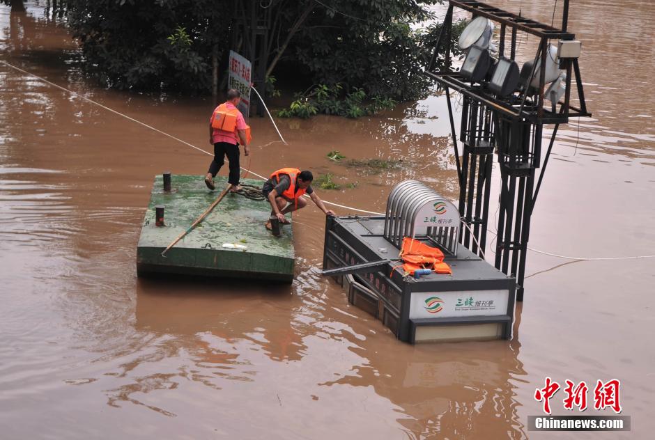 9月19日,长江洪峰过境重庆主城,朝天门码头被淹。朝天门广场上空无一人,由于洪水水位过高,已禁止游客进入,只有几名商户老板坐在朝天门码头梯坎上,旁边堆放着从商店搬出来的一部分货物,久久不愿离去,都在等待洪水退去。据一商户老板介绍:“由于洪水来的太急,很多商店的货物还未来得及搬离,现在还泡在水中,也有些货物随着洪水冲走了,现在只希望把损失降至最低”。陈超 摄