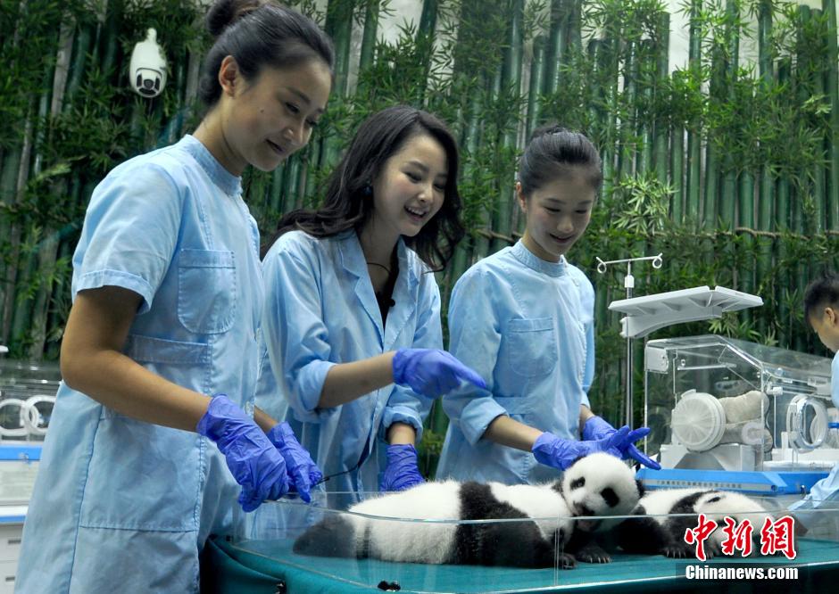 9月19日,2014中华小姐环球大赛16强佳丽齐集广州长隆野生动物世界惊艳亮相,一同探望了全球唯一存活的“大熊猫三胞胎”,并为其取名。10月25日,“2014中华小姐环球大赛”总决赛将在珠海长隆横琴湾酒店举行。中新社发 刘卫勇 摄