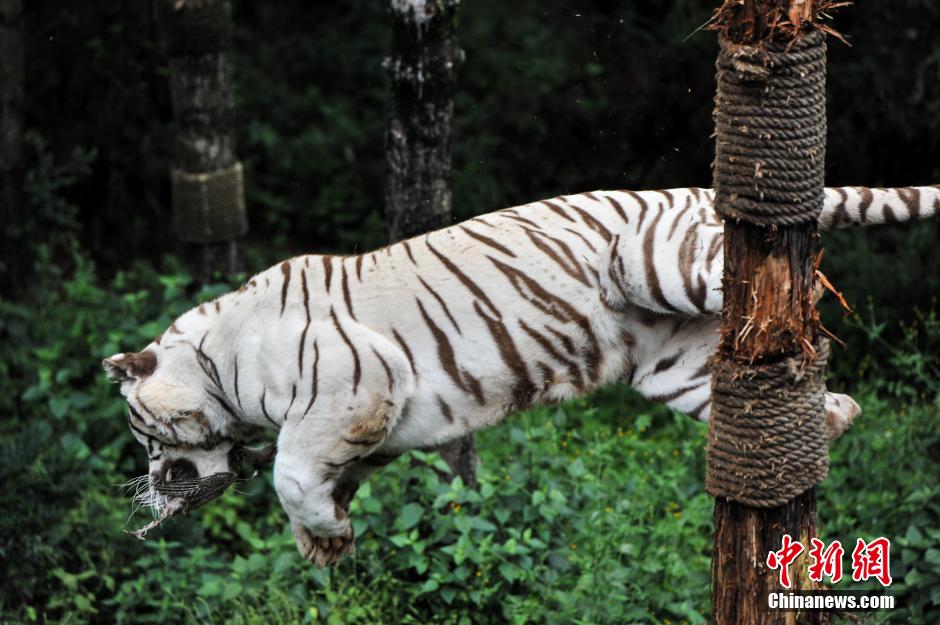 9月19日,云南野生动物园内白虎爬上高5米的云杉树,捕食野鸡。据饲养员介绍,用活鸡让白虎爬树捕食是野化训练的一部分,因为动物园内的老虎长期过着“衣来伸手、饭来张口”的生活,缺乏锻炼的它们捕食能力非常弱,野性也逐步退化,一些心血管疾病也在影响着它们的健康。中新社发 任东 摄