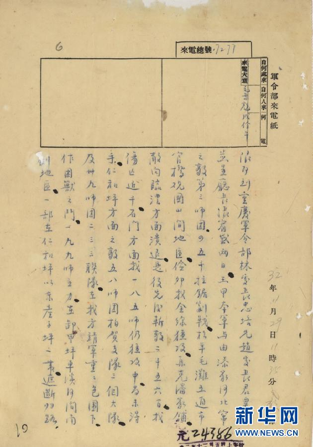 1943年11月28日,第十集团军参谋长毛景彪报告常德周边战况致军令部电。 9月20日,国家档案局在其官网发布《浴血奋战——档案里的中国抗战》第二十七集:常德会战。 新华社发(中国第二历史档案馆提供)