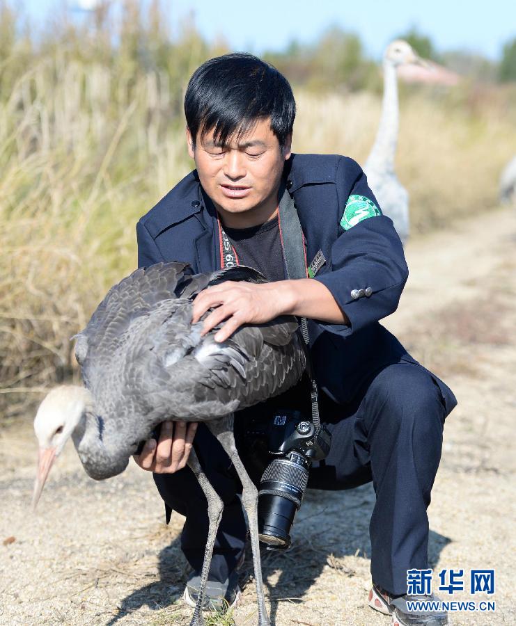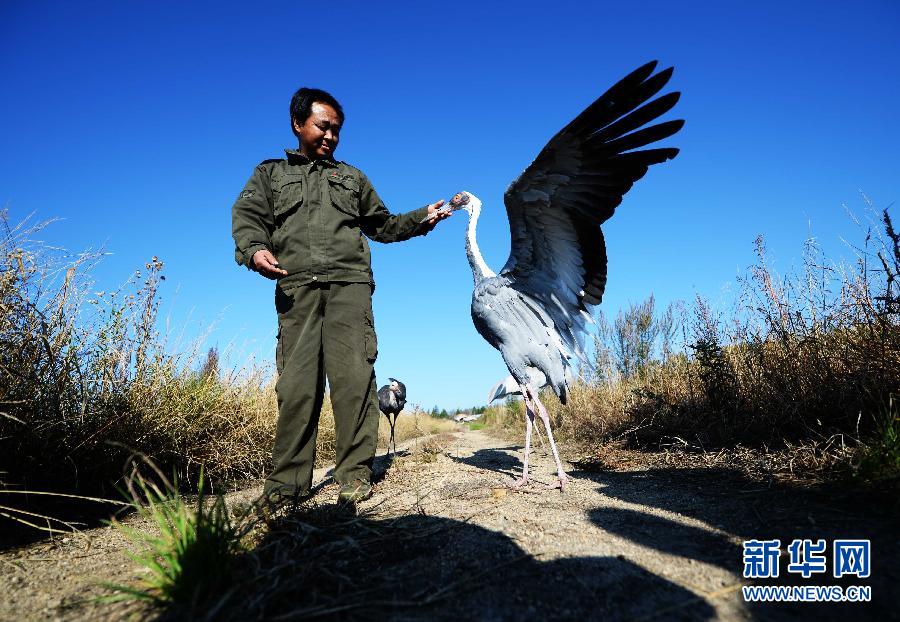 乌斯孟野生动物救助站饲养员张彬在对白头鹤和白枕鹤野化训练时和一只白枕鹤在一起(9月19日摄)。 新华社记者 王凯 摄
