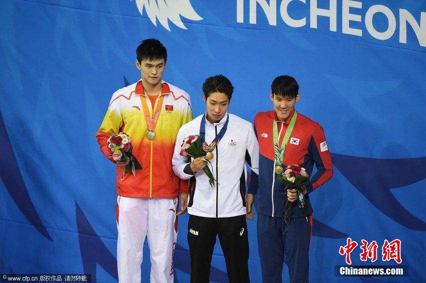 2014年9月21日,韩国仁川,2014仁川亚运会次日男子200米自由泳决赛,日本选手萩野公介夺得冠军,孙杨憾失金牌,朴泰桓夺得第三。