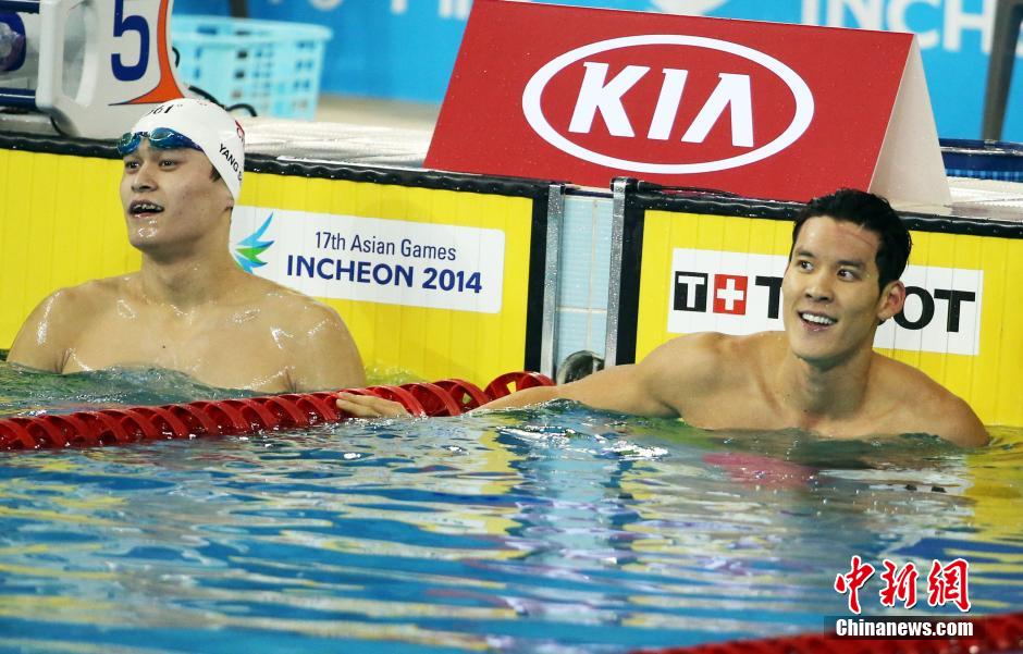 9月21日,2014年仁川亚运会男子200米自由泳展开决赛争夺,日本选手荻野公介夺得冠军,孙杨力压朴泰桓获得亚军,朴泰桓获第三名。赛后,孙杨、朴泰桓泳池演绎“兄弟情深”。中新社记者 汤彦俊 摄