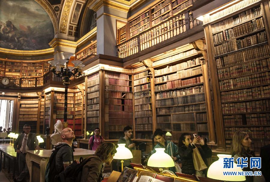 9月21日,游客在法国巴黎的国民议会图书馆参观。当日,法国第31届欧洲文化遗产日落幕。本届遗产日为期两天,期间公立博物馆免费参观,私立博物馆门票减价。此外,法国总统府、总理府、国民议会、外交部、国宾馆、巴黎市政厅等同时对观众免费开放。新华社记者陈晓伟摄