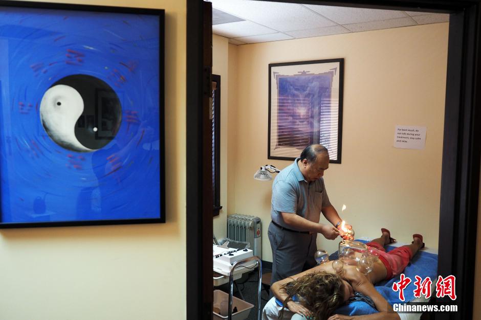 在美国洛杉矶西裔聚居的圣塔莫尼卡遍布着相当数量的中医诊所。当手术后依然积水疼痛的膝盖、久治不愈的腰椎间盘突出等病症的患者在中医针灸的治疗下得到明显好转时,原本并不被一些人看好的中医,在美国“洋人”圈子中却越来越受到青睐。图为在美国行医20余年,身为清代著名中医温病学家吴鞠通的第七代传人的吴宝林为患者拔火罐。中新社发 毛建军 摄