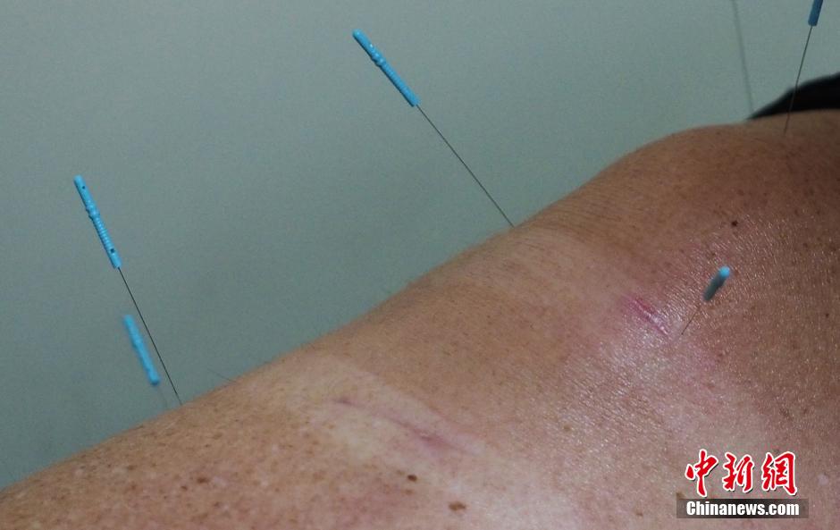 图为在美国行医20余年,身为清代著名中医温病学家吴鞠通的第七代传人的吴宝林为患者针灸。中新社发 毛建军 摄