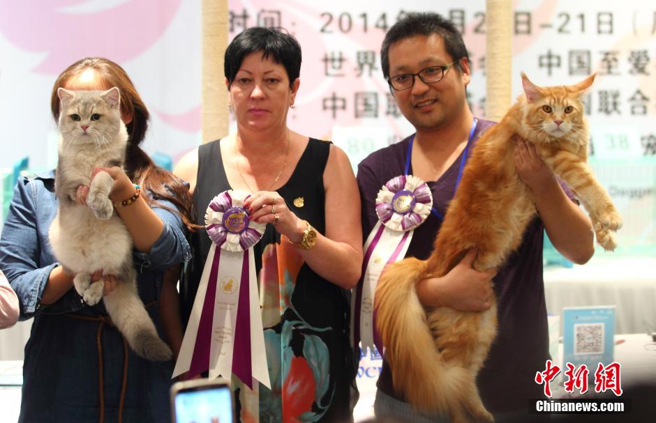 9月20日,WCF国际纯种猫展在南京举行,美国卷耳猫、加拿大无毛猫、豹猫、英国/美国短毛猫等二十多个优秀品种的世界名猫参赛,吸引了众多市民前来与“喵星人”近距离互动。展览现场还进行了WCF系统的纯种猫血统鉴定。图为获奖的猫咪与主人合影。中新社发 泱波 摄