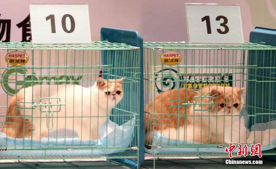 9月20日,WCF国际纯种猫展在南京举行,美国卷耳猫、加拿大无毛猫、豹猫、英国/美国短毛猫等二十多个优秀品种的世界名猫参赛,吸引了众多市民前来与“喵星人”近距离互动。展览现场还进行了WCF系统的纯种猫血统鉴定。图为参赛的猫咪等候上场。中新社发 泱波 摄
