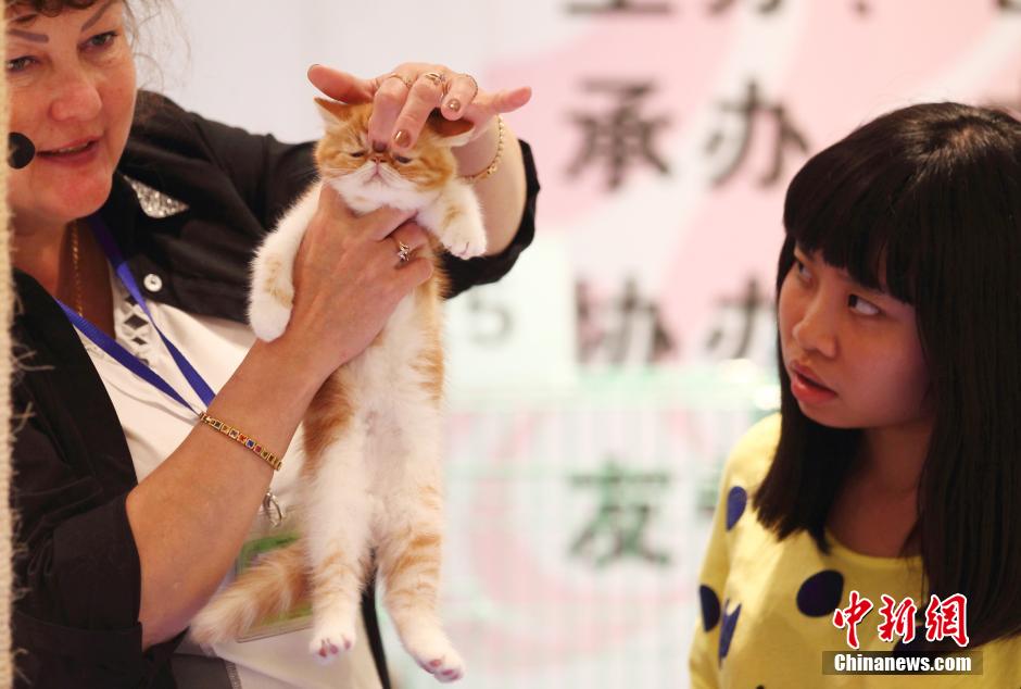 9月20日,WCF国际纯种猫展在南京举行,美国卷耳猫、加拿大无毛猫、豹猫、英国/美国短毛猫等二十多个优秀品种的世界名猫参赛,吸引了众多市民前来与“喵星人”近距离互动。展览现场还进行了WCF系统的纯种猫血统鉴定。图为评委对参赛的猫咪进行点评。中新社发 泱波 摄