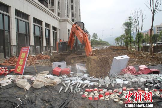 图为挖掘机碾压伪劣消防水袋和消火栓箱。 吴懿瑾 摄