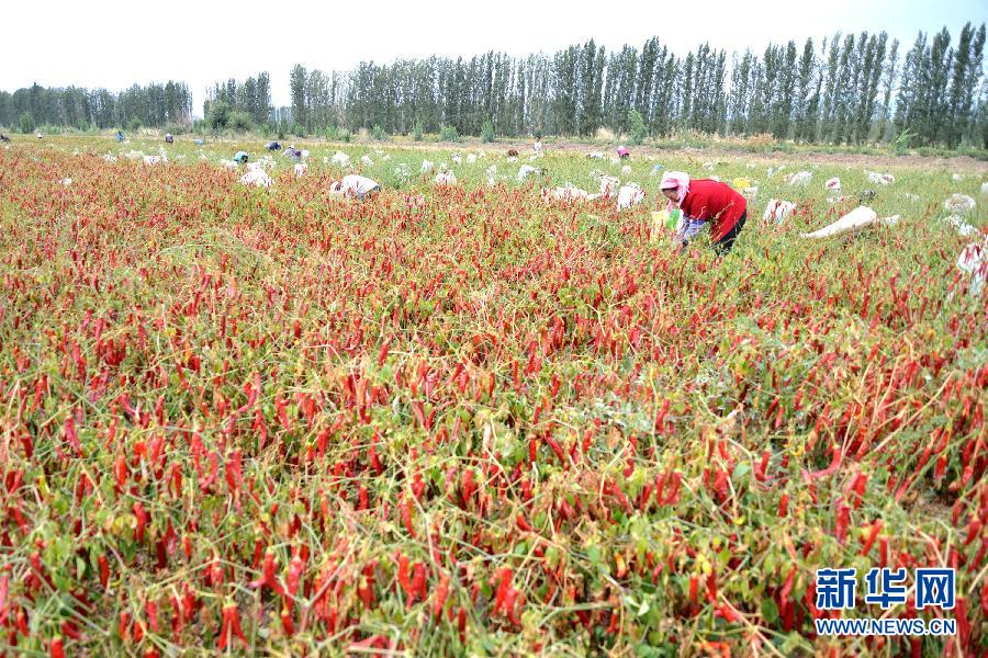 9月22日,新疆生产建设兵团第二师二十一团农民在抢时采摘航天椒。金秋时节,位于新疆巴音郭楞蒙古自治洲和静县的二十一团,经过航天搭载繁育的辣椒获得大面积丰收,平均干辣椒亩产超过600公斤,最高亩产达850公斤,创历史新高,总产占全疆红辣椒产量的30%。该辣椒因椒形大、无公害、色泽好,红色素和辣椒碱的含量位居新疆所产辣椒前列,吸引了众多客商前来采购,其产品85%远销到日本、韩国、巴西等海外市场,火红的辣椒成为当地农民增收致富的支柱产业。新华社发(杜炳勋 摄)