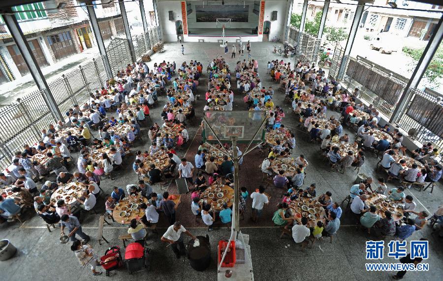 毛俊村一户家庭在操办白事,村里的乡亲们都自发赶过来帮忙张罗,而村篮球场被临时用作白事宴席场地摆起了百家宴(9月17日摄)。湖南省蓝山县毛俊村曾是一个远近闻名的“法外之地”:村霸横行、帮派林立、宗族势力各据一方。近年来,通过充实基层党组织力量,建立公开透明的监督机制,用“国法村规”取代“江湖规矩”,村民的观念和风气发生了根本性变化。如今,这里已成为湖南省著名的“民主法治示范村”和“新农村建设示范村”。 新华社记者 李尕 摄