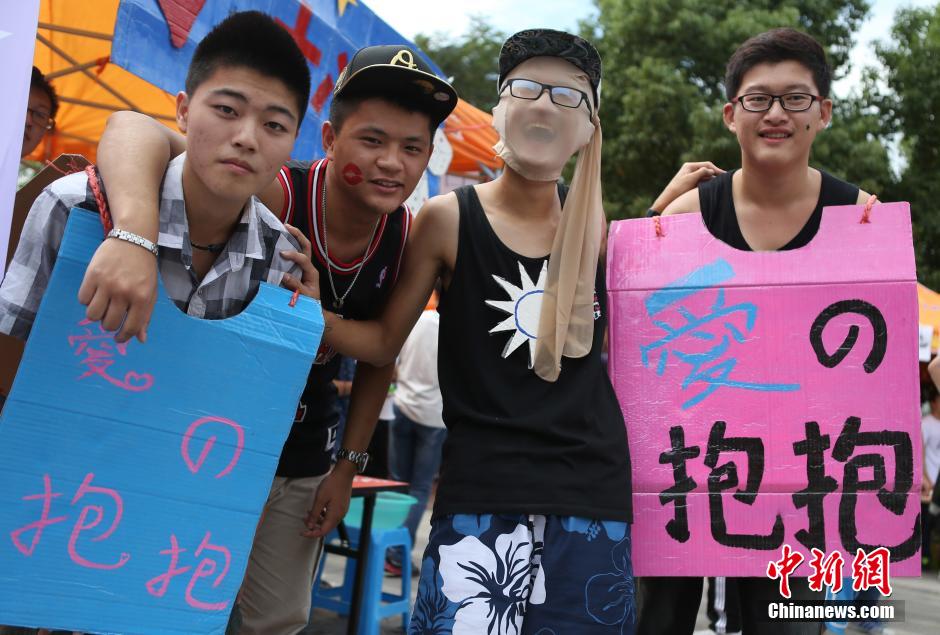 9月22日,一年一度的南京东南大学新生文化季“百团大战”在该校九龙湖校区拉开大幕,科技、文化、体育、艺术等五大类,一百多个学生社团摆开阵势摇旗呐喊,纷纷以自己的特色在现场吹拉弹唱、卖力吆喝,以此来吸引新生加入,热闹不已的场景形成了一道独特的人文景观。图为同学们搞怪赚人气。 中新社发 泱波 摄