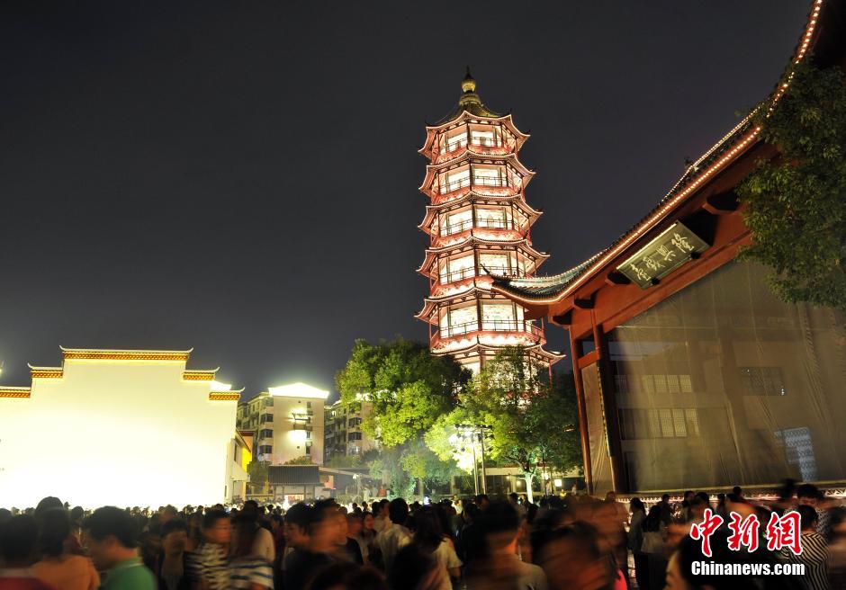 9月22日,为期18天的江西南昌绳金塔美食文化艺术节暨第十三届绳金塔庙会正式拉开帷幕。当晚,绳金塔下景色靓丽、美食汇集、节目精彩,吸引了大量市民和游客慕名而来,他们在这里可以尽情吃喝玩乐,享受惬意生活。绳金塔庙会作为南昌市一个特殊的节日,每年九月至十月在千年古塔绳金塔内举行。图为绳金塔下景色靓丽、美食汇集、节目精彩,吸引了大量市民和游客慕名而来。 刘占昆 摄