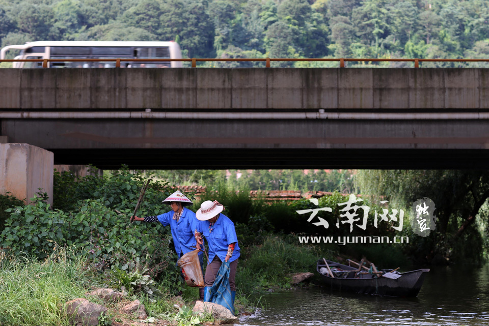 打捞乘客从车窗里丢往滇池里的垃圾。记者王宇衡 摄