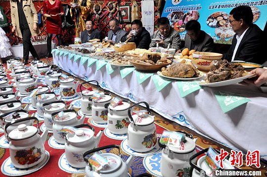 毡房中摆放了56个独具哈萨克族风情的奶茶壶,每个奶茶壶中都盛放着不同口味的奶茶,塔尔米奶茶、奶皮子奶茶、香味奶茶、酥油奶茶、炒面奶茶、初乳奶茶、银杏奶茶……56种不同的奶茶让人目不暇接,前来品尝的群众面对这么多种的奶茶口味选择也大呼过瘾。新疆阿勒泰市22日向外界发布消息称,该市获得了56种哈萨克族奶茶文化、传统美食基尼斯世界纪录证书。