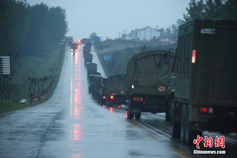 近日,解放军兵种部队跨区基地化训练进入“收官之战”,陆军第26集团军某炮兵旅转战千余公里,机动至南京军区三界训练基地,开展代号为“火力-2014·三界”的实战化演练,并即将进行实弹战术演习。从7月到9月,总参谋部组织6个炮兵旅、4个防空旅,进行代号为“火力-2014”的跨区基地化训练。集中组织兵种部队跨区基地化训练,在中国军队军事训练领域还是首次。图为冒雨向预定地域开进。中新社发 徐宁 摄