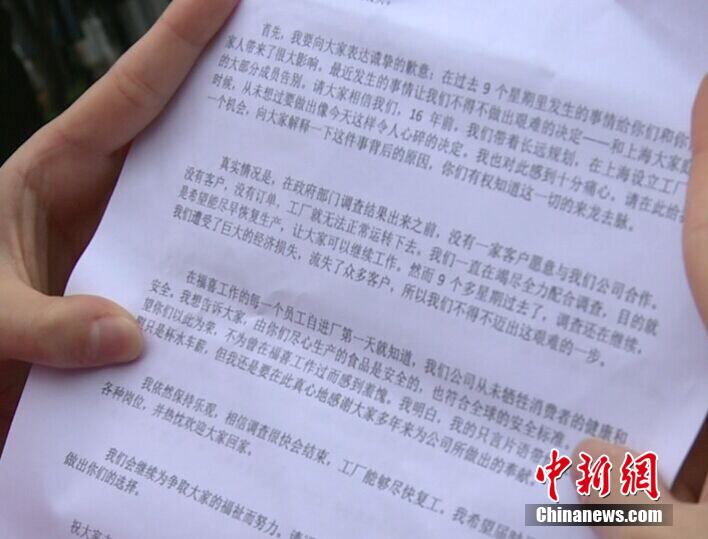 9月22日,福喜集团在官网《上海福喜事件更新》一栏中声明,将于今日针对上海福喜食品有限公司执行员工遣散计划。当天下午,记者在现场看到陆续有签好解除劳动合同协议的员工走出该公司。今年7月下旬,上海福喜食品有限公司被媒体爆出存在安全卫生问题,随后影响了麦当劳等在华经营的快餐品牌。图为对员工的声明。康玉湛 摄