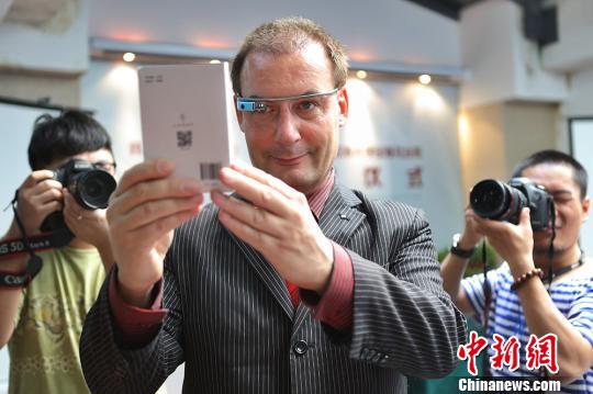 图为欧洲大学出版社社长吴漠汀在首发式上戴谷歌眼镜体验跨超本《红楼梦》。泱波 摄