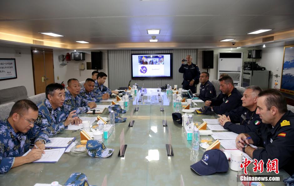 当地时间9月22日上午,欧盟465编队指挥官、意大利海军少将吉多·兰多登临中国海军第十八批护航编队两栖船坞登陆舰长白山舰,与编队指挥员、南海舰队副参谋长张传书少将进行了会面交流。图为中国海军第十八批护航编队指挥员张传书少将与欧盟465编队指挥官吉多兰多少将一行座谈。中新社发 甘俊 摄