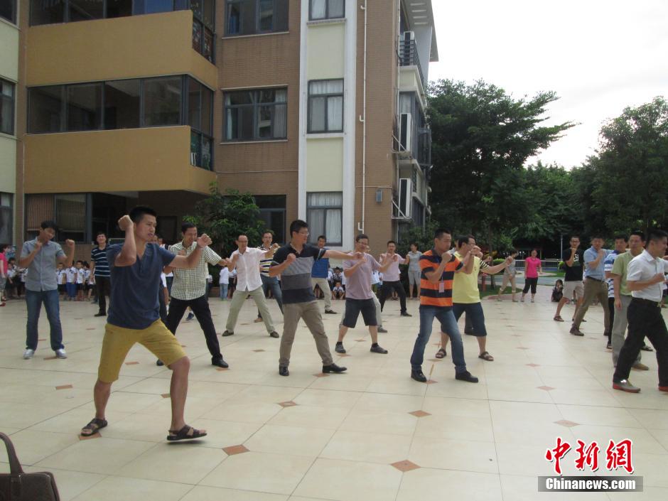 “用我们的行动,捍卫孩子们的生命安全,用我们的努力,成就孩子们的幸福生活!”经过长时间准备,2014年9月22日,福建省福州市一幼儿园正式启用“爸爸联防队”,50余名自愿者爸爸进行了宣誓仪式。据悉,联防队由校内学生的爸爸们组成,维护上放学期间的孩子们的安全。筹备期内,由当地民警教授“爸爸联防队”成员擒拿格斗术及遇到突发事件时的处置方法。图为自愿者爸爸跟当地民警学习擒拿格斗术。 上渡综 摄