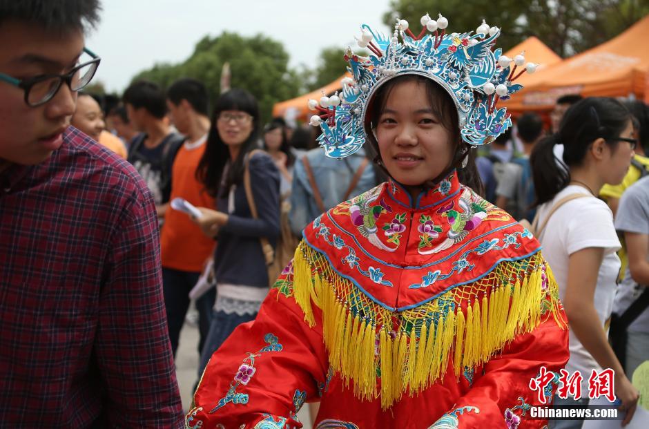 9月22日,一年一度的南京东南大学新生文化季“百团大战”在该校九龙湖校区拉开大幕,科技、文化、体育、艺术等五大类,一百多个学生社团摆开阵势摇旗呐喊,纷纷以自己的特色在现场吹拉弹唱、卖力吆喝,以此来吸引新生加入,热闹不已的场景形成了一道独特的人文景观。图为该校小词戏剧社的成员着戏装吸引眼球。 中新社发 泱波 摄
