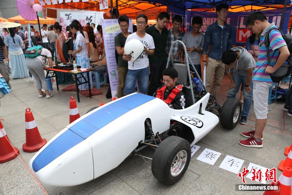 9月22日,一年一度的南京东南大学新生文化季“百团大战”在该校九龙湖校区拉开大幕,科技、文化、体育、艺术等五大类,一百多个学生社团摆开阵势摇旗呐喊,纷纷以自己的特色在现场吹拉弹唱、卖力吆喝,以此来吸引新生加入,热闹不已的场景形成了一道独特的人文景观。图为该校力魔车队的方程式赛车在现场作展示。 中新社发 泱波 摄