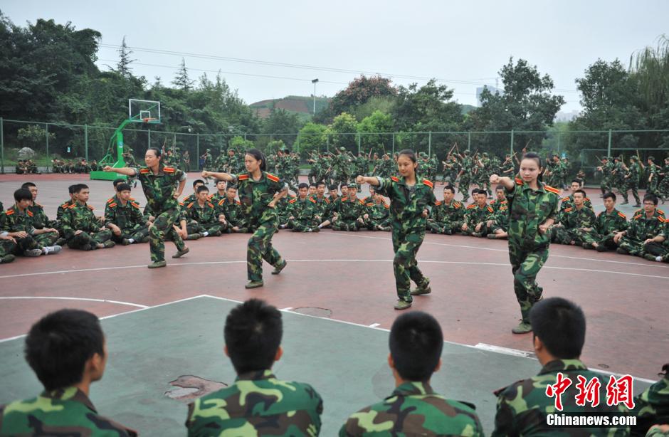 9月22日,四川城市职业学院5100名新生军训紧张进行,军训中除了正常的科目外,教官们还教女生拳术、女子防狼术、棍术、防暴、急救、格斗等科目,让新入校的大学们在危急时如何进行自救和救人,在提升身体素质的同时,加强学生们的自我保护能力和增强实战经验。图为女大学们正在学拳术,保护自身安全。刘忠俊 摄