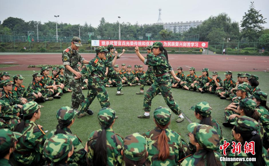 女大学生们正在教练的指导下学习拳术。刘忠俊 摄