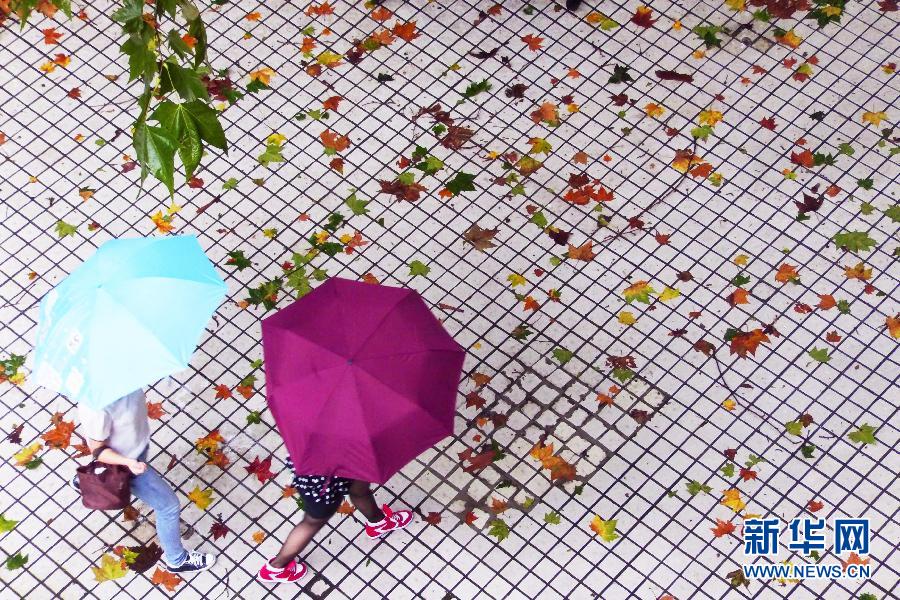 9月23日,市民走在遍布行道树落叶的路面上。据上海市公共气象服务中心通报,今年第16号台风“凤凰”的环流中心于23日上午10时45分在上海市奉贤区海湾镇沿海登陆。受此影响,22日20时至23日11时,上海普降大雨到暴雨,大部地区雨量在30~70毫米。预计“凤凰”登陆后继续向东北偏北方向移动,在傍晚前后东移入海。上海下午仍有风雨天气,北部地区有大雨,夜间风雨减弱。新华社发(张波 摄)