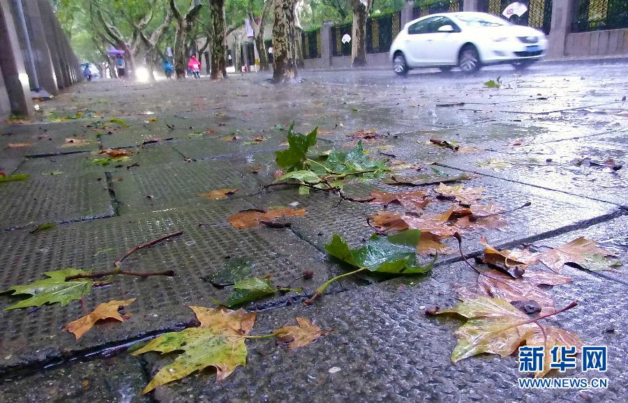 9月23日,上海徐汇区岳阳路人行道上遍布行道树落叶。据上海市公共气象服务中心通报,今年第16号台风“凤凰”的环流中心于23日上午10时45分在上海市奉贤区海湾镇沿海登陆。受此影响,22日20时至23日11时,上海普降大雨到暴雨,大部地区雨量在30~70毫米。预计“凤凰”登陆后继续向东北偏北方向移动,在傍晚前后东移入海。上海下午仍有风雨天气,北部地区有大雨,夜间风雨减弱。新华社发(张波 摄)