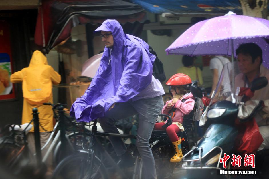 在沪外国人冒雨骑车送孩子上学。潘索菲 摄