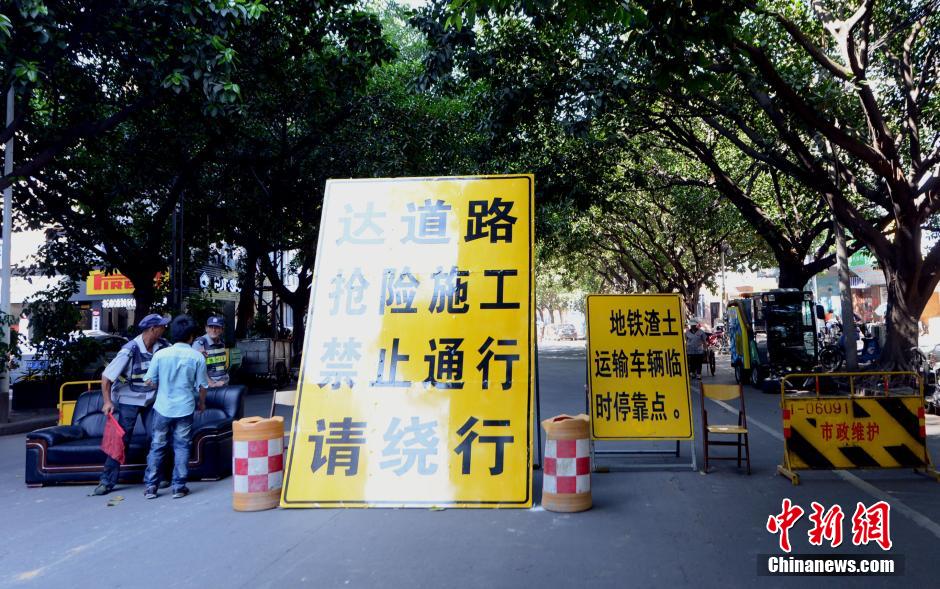 9月23日,施工人员正在对福州地铁1号线达道站路段突现沉降的路面进行抢修。9月22日日凌晨3时许,福州地铁1号线达道站路段,部分基坑地下连续墙突发涌水,同时路面也出现沉降。福州市地铁公司表示,达道区域临近闽江,地下为强透水砂层,涌水疑似碰到地下暗河。同时,渣土和载重车辆频繁出入工地,导致路面破损,并出现沉降。此次抢修,将对沉降的路面一并修复。为确保抢修期间道路交通安全,福州警方决定,22日起至施工结束,对达道路实行临时交通管制,禁止机动车通行。 刘可耕 摄
