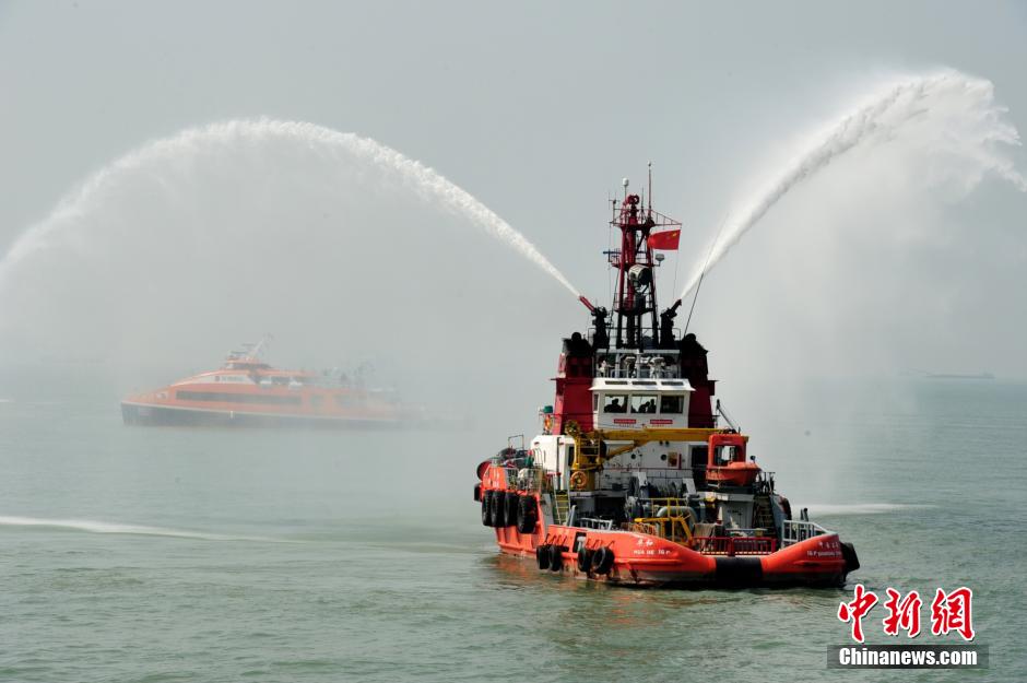 9月23日,深圳海事、南海救助局、公安边防、渔政、海关、消防、拖轮等单位组织的海上救援队在孖洲水域进行海上综合应急暨海底输气管道泄漏应急演习。联合救援队及时将遇险客轮“鹏星16号”上的80名被困乘客安全转移,同时排除了西气东输香港支线发生海底输气管道泄漏险情。图为演习现场。中新社发 陈文 摄