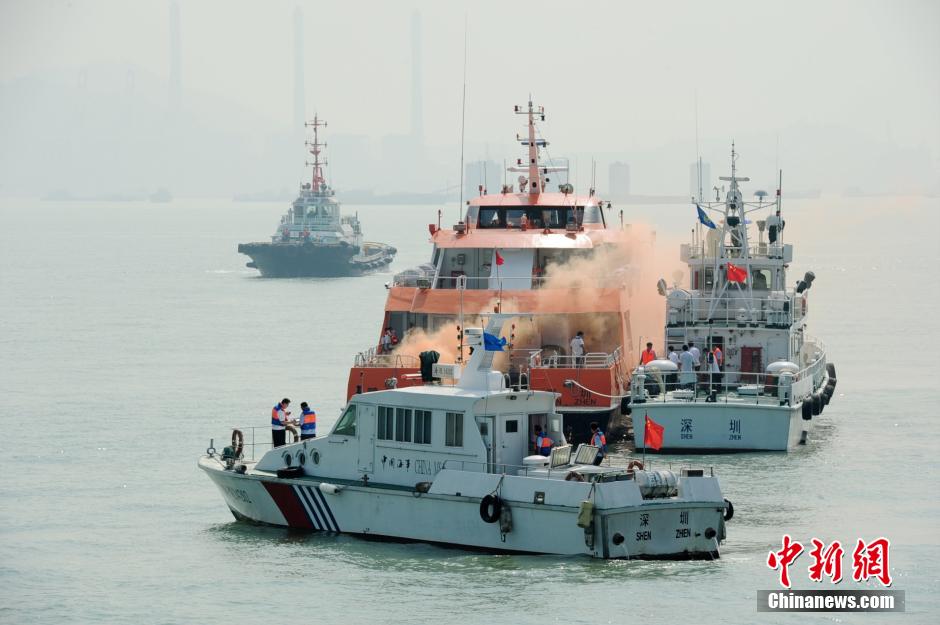 9月23日,深圳海事、南海救助局、公安边防、渔政、海关、消防、拖轮等单位组织的海上救援队在孖洲水域进行海上综合应急暨海底输气管道泄漏应急演习。联合救援队及时将遇险客轮“鹏星16号”上的80名被困乘客安全转移,同时排除了西气东输香港支线发生海底输气管道泄漏险情。图为演习现场。中新社发 陈文 摄