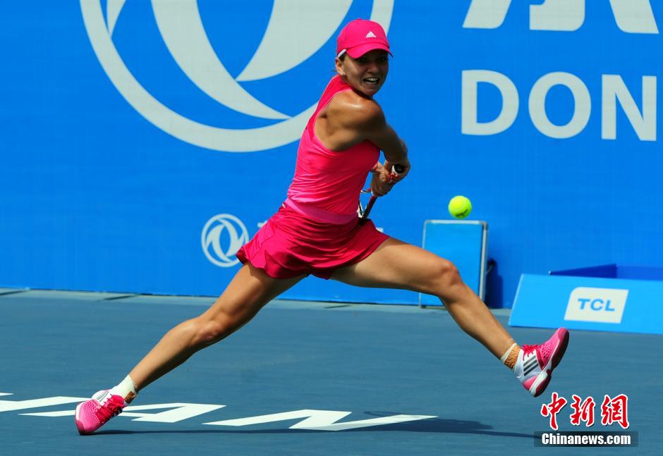 9月23日,穆古鲁扎在比赛中发球。当日,WTA武汉网球公开赛正赛进入第三天,在当天上午的一场比赛中,世界排名第二、赛会二号种子罗马尼亚哈勒普爆冷以1比2被西班牙穆古鲁扎淘汰出局。中新社发 张畅 摄