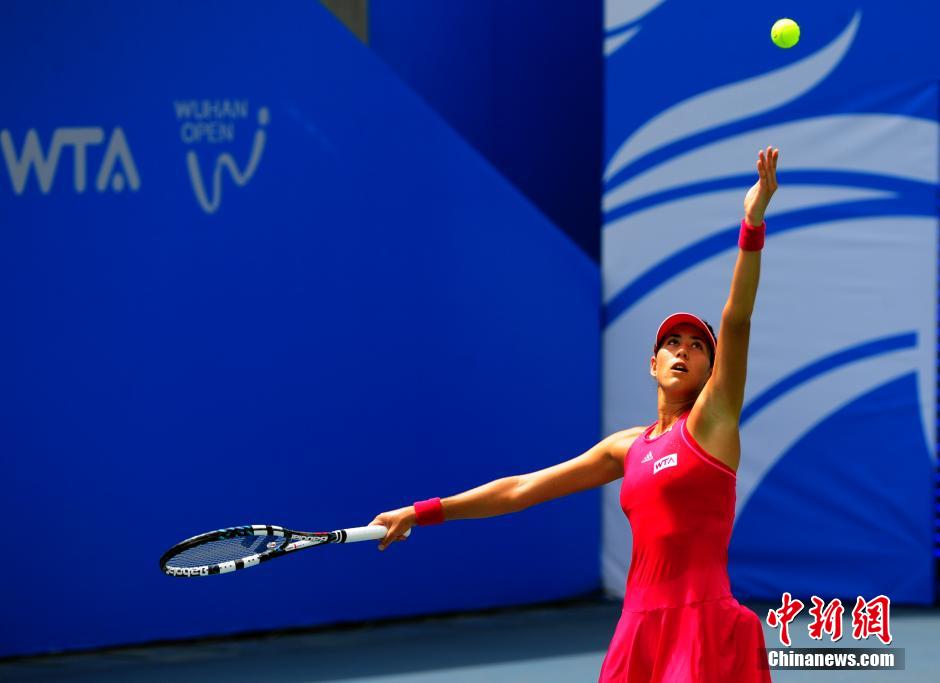 9月23日,穆古鲁扎在比赛中发球。当日,WTA武汉网球公开赛正赛进入第三天,在当天上午的一场比赛中,世界排名第二、赛会二号种子罗马尼亚哈勒普爆冷以1比2被西班牙穆古鲁扎淘汰出局。中新社发 张畅 摄