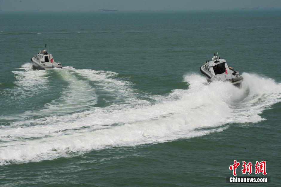 9月23日,深圳海事、南海救助局、公安边防、渔政、海关、消防、拖轮等单位组织的海上救援队在孖洲水域进行海上综合应急暨海底输气管道泄漏应急演习。联合救援队及时将遇险客轮“鹏星16号”上的80名被困乘客安全转移,同时排除了西气东输香港支线发生海底输气管道泄漏险情。图为演习现场。中新社发 陈文 摄