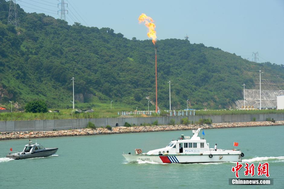 9月23日,深圳海事、南海救助局、公安边防、渔政、海关、消防、拖轮等单位组织的海上救援队在孖洲水域进行海上综合应急暨海底输气管道泄漏应急演习。联合救援队及时将遇险客轮“鹏星16号”上的80名被困乘客安全转移,同时排除了西气东输香港支线发生海底输气管道泄漏险情。图为演习现场。中新社发 陈文 摄