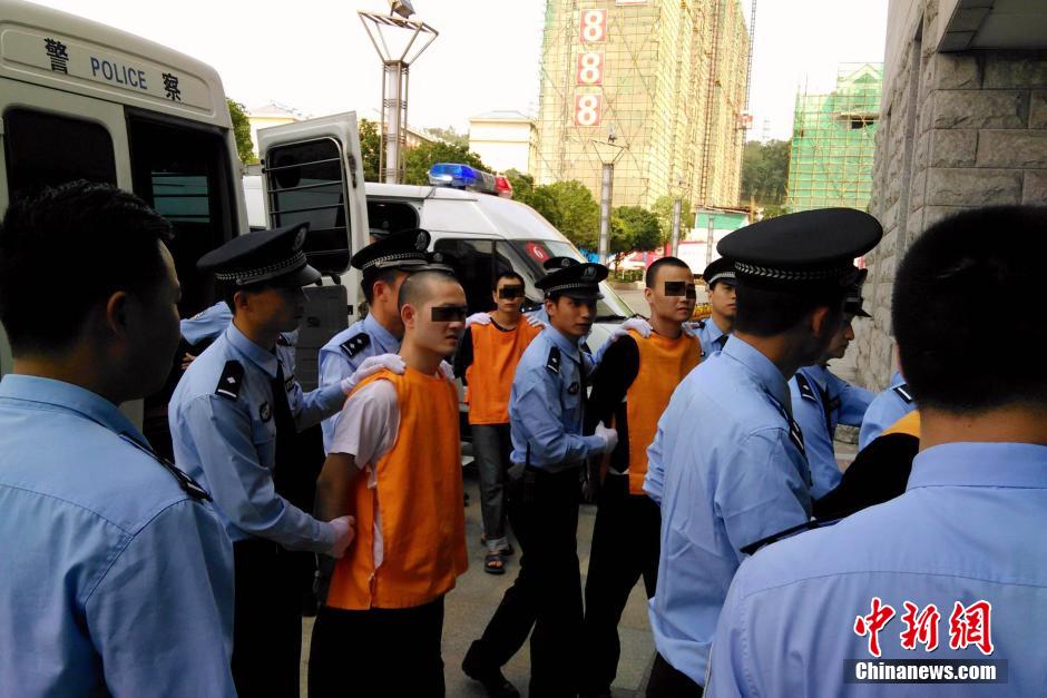 9月23日,湖北省荆门市掇刀区人民法院在荆门市体育文化中心公开开庭审理蒋某、邹某等22人涉嫌组织、领导、参加黑社会性质组织案件。2013年3月24日,一男子在掇刀亿达花园小区门前被多名男子持刀砍伤。警方在侦查中发现荆门城区2个违法犯罪团伙纠集,逐渐形成一个组织严密,成员固定,层级分明的黑社会性质犯罪团伙,警方在侦办案件中共查获气枪一把、砍刀57把。团伙配备有车辆、对讲机等设备,并提供食宿和发放费用。2013年8月,警方将该团伙主要骨干成员一网打尽。由于涉案人员众多,该案预计将审理3天。图为警方将犯罪嫌疑人押解到法庭。中新社发 吴奇勇 摄
