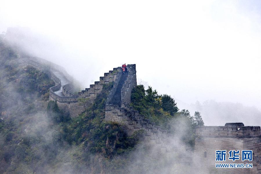 9月23日,一场秋雨过后,天津蓟县黄崖关长城披上了一层轻纱霓裳,宛如一幅壮美的水墨画卷。 新华社发(杨艳波 摄)