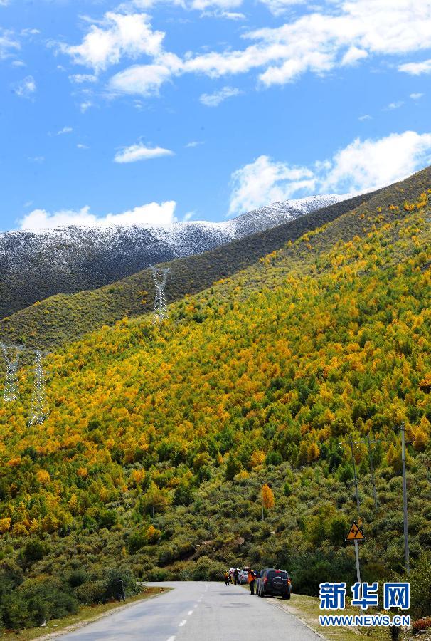9月23日,游人在川藏公路西藏工布江达县境内欣赏美丽的秋景。进入秋季,西藏高原在蓝天白云的映衬下,勾勒出一幅幅色彩斑斓的画面,美不胜收。 新华社记者 文涛 摄