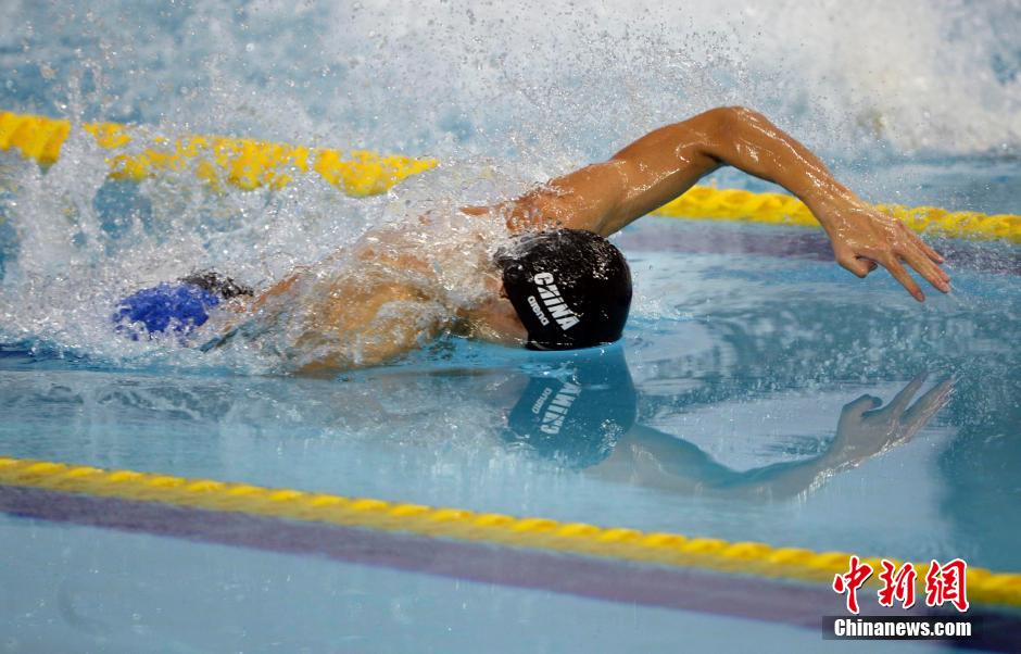 9月23日,2014年韩国仁川亚运会进入到第四个比赛日的争夺。在仁川文鹤朴泰桓游泳馆举行的男子50米自由泳决赛中,宁泽涛以21秒95的成绩拿到金牌,这也是中国男子游泳选手在本届亚运会上拿到的第一枚金牌。中新社记者 廖攀 摄