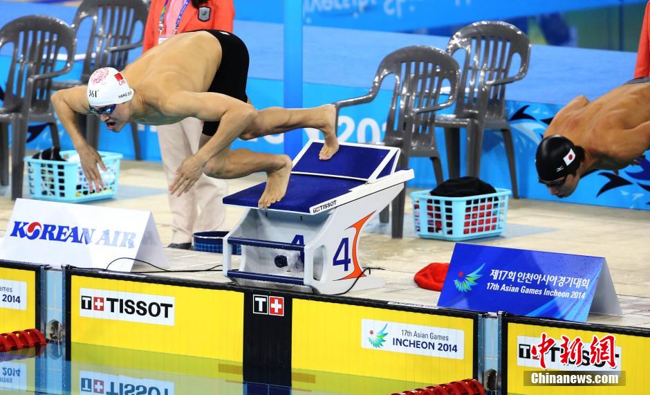 9月23日,孙杨在比赛中起跳。当日,在2014仁川亚运会男子400米自由泳决赛中,中国选手孙杨以3分43秒23夺冠,韩国选手朴泰桓获得季军。中新社记者 汤彦俊 摄