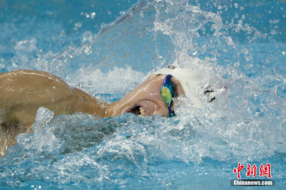 9月23日,仁川亚运会游泳男子400米自由泳决赛中,中国选手孙杨夺得冠军,日本萩野公介获得亚军,韩国朴泰桓落后较多名列第三。中新社记者 廖攀 摄