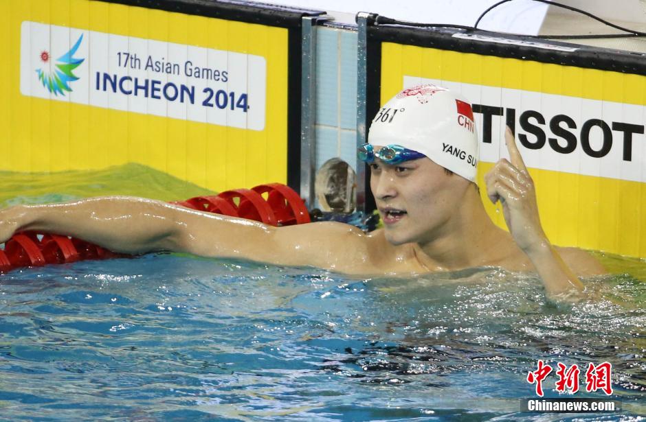 9月23日,仁川亚运会游泳比赛继续在文鹤朴泰桓游泳馆展开争夺,中国选手孙杨在男子400米自由泳的决赛中,以3分43秒23夺得冠军。中新社发 汤彦俊 摄