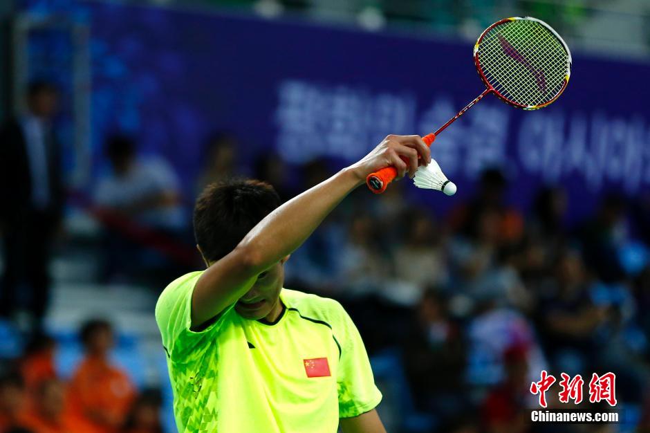 9月23日,仁川亚运会羽毛球男子团体决赛在桂阳体育馆打响。在首场单打比赛中,中国队谌龙(图)以1-2不敌韩国选手孙完虎,中国队暂时0-1落后。中新社记者 富田 摄