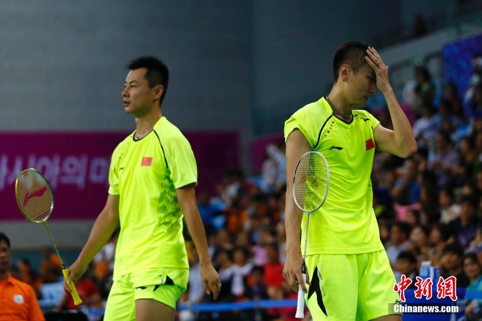 9月23日,仁川亚运会羽毛球男子团体决赛在桂阳体育馆打响。在第二场双打比赛中,中国组合徐晨、张楠(图)以0-2不敌韩国组合李龙大、柳延星,中国队暂时0-2落后。中新社记者 富田 摄