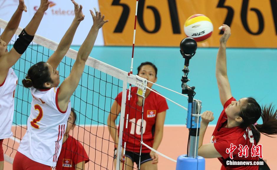 9月23日,仁川亚运会女排小组赛在松林体育馆进行,香港女排面对实力强大的中国女排时丝毫没有畏惧,全队发挥出色敢打敢拼赢得观众喝彩。中新社记者 汤彦俊 摄