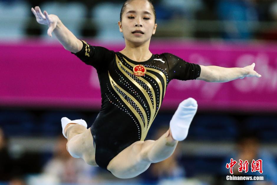 9月23日,仁川亚运会女子体操个人全能决赛中,中国选手姚金男以57.900分获得冠军,商春松以56.95分摘得银牌,铜牌被韩国选手Yun Narae获得,成绩是55.000分。图为姚金男在自由体操比赛中。中新社记者 张浩 摄